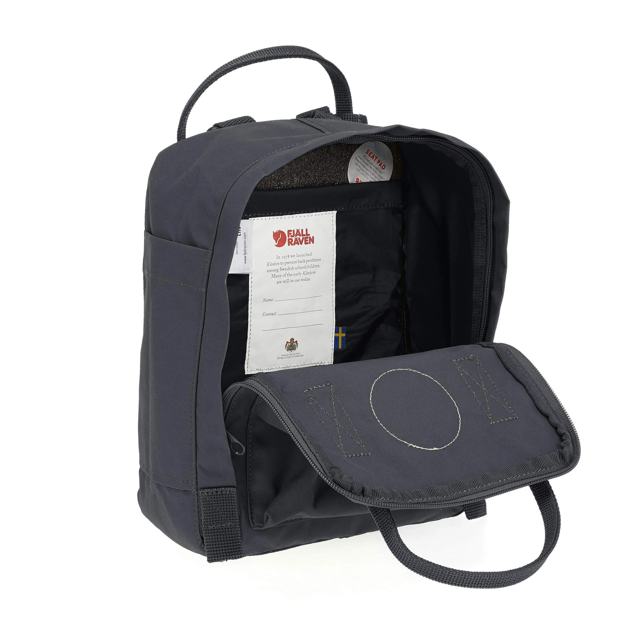 Eine Beschichtung ist dadurch überflüssig. Dank des weit umlaufenden Zwei-Wege-Reißverschlusses lässt sich der Kanken Mini ganz bis zum Rucksackboden öffnen. Eine herausnehmbare Schaumstoffplatte polstert den Rücken und kann bei Bedarf als Sitzkissen verwendet werden.