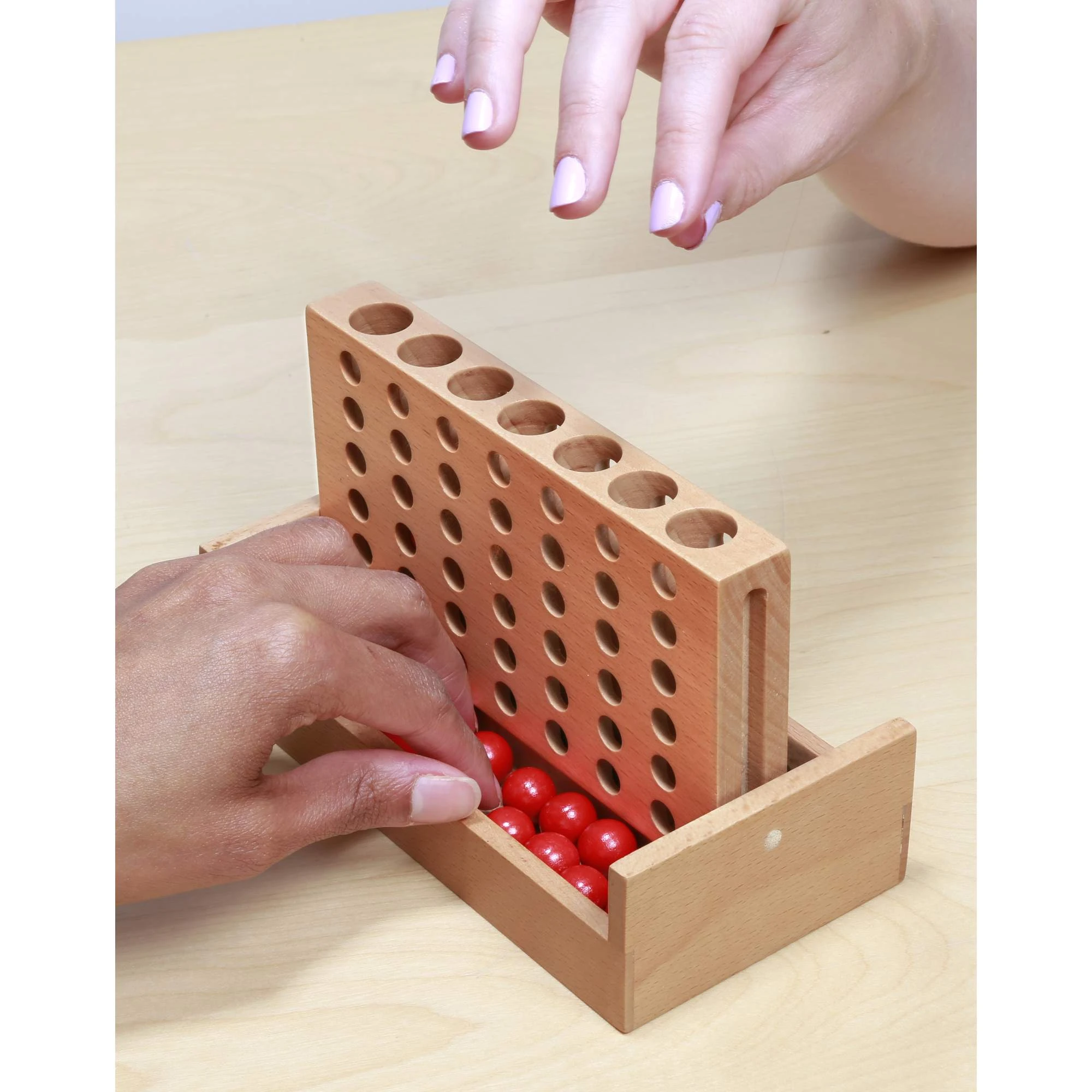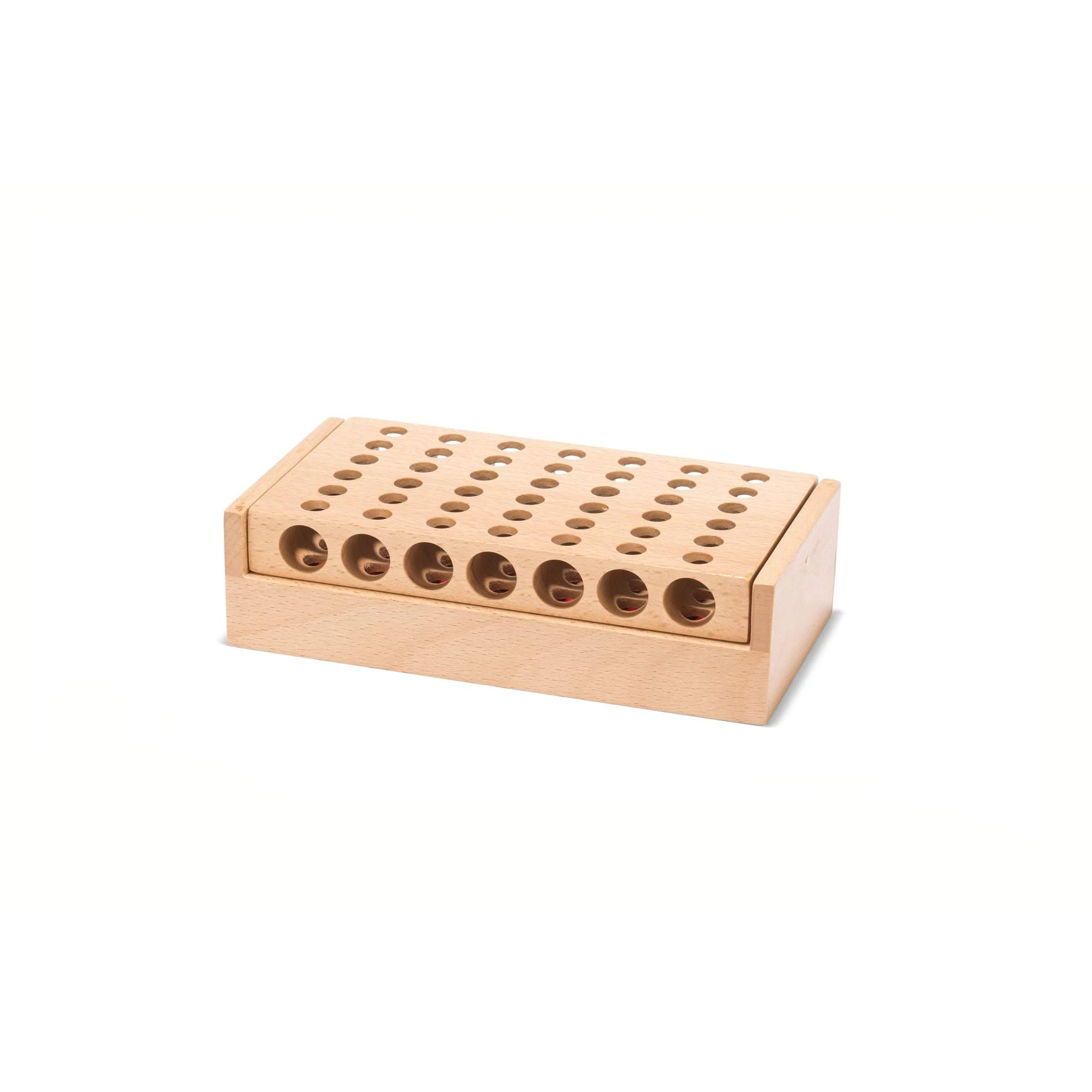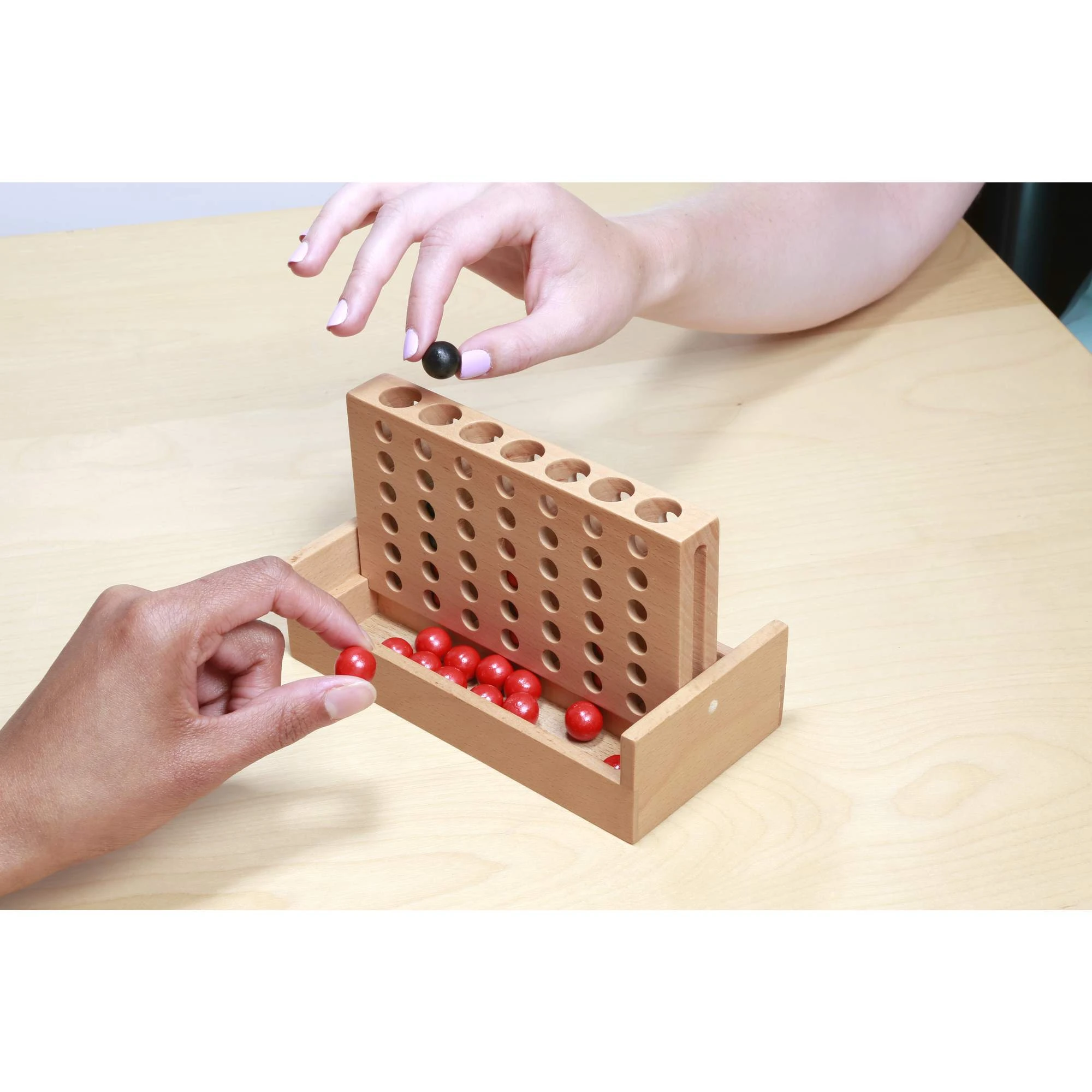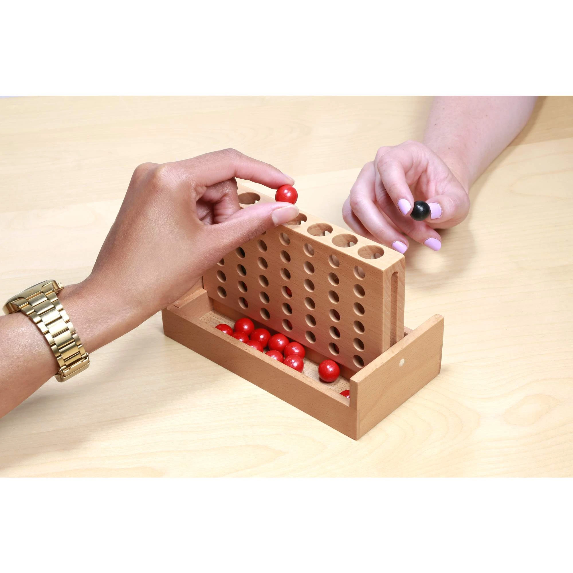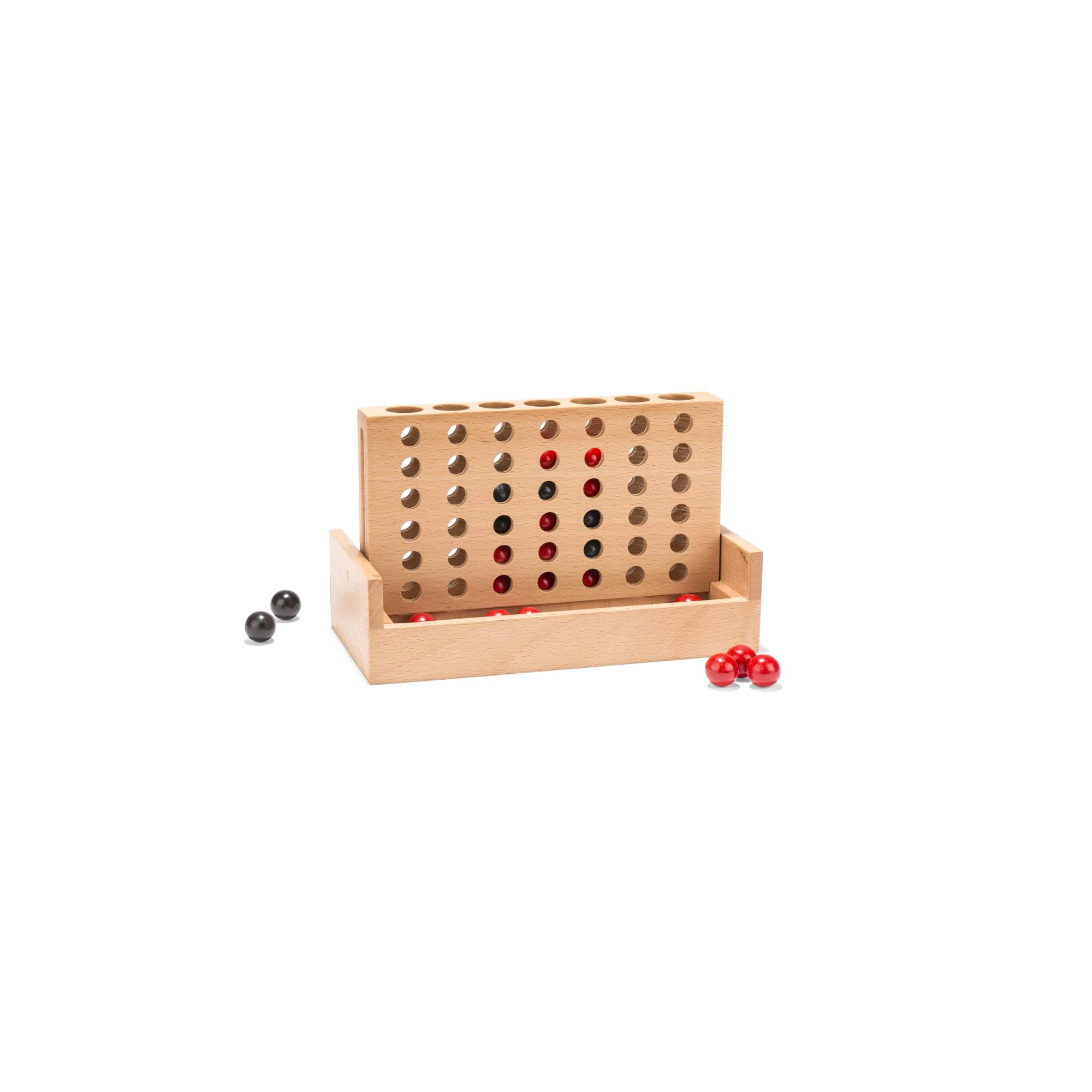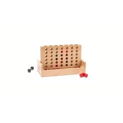 Klassisches Vier-Reihen-Strategiespiel. Das Spielbrett aus massivem Buchenholz in Reisegröße verfügt über ein Cabrio-Design, das geschlossen kippbar ist, um die Spielfiguren aufzunehmen.