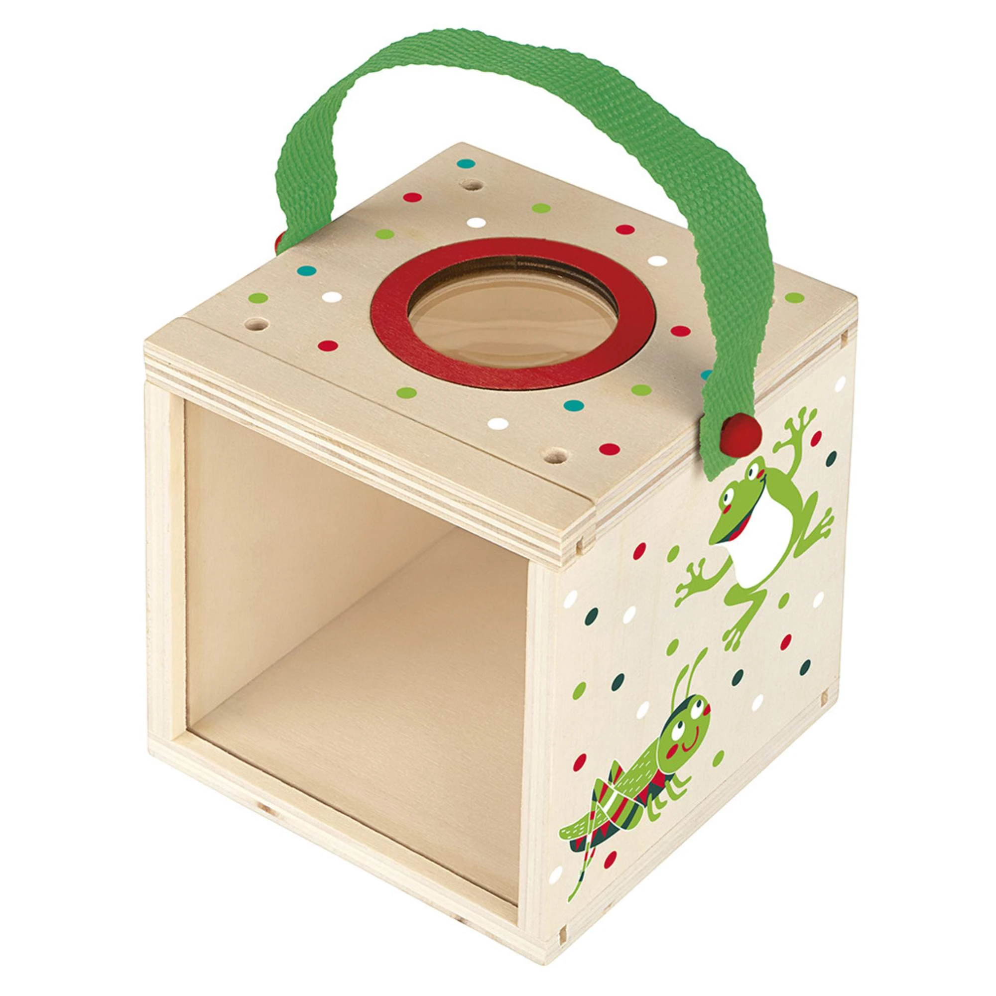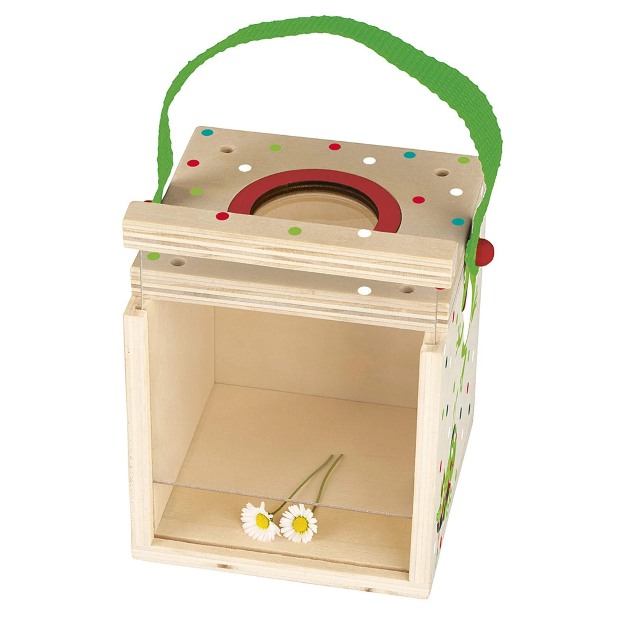 Die Krabbelkäfer Beobachtungsbox aus Holz besticht durch ihr kunterbuntes buntes Punkte-Design. Auf der Seite sind die niedlichen Krabbelkäfer Charaktere, Frosch und Heuschrecke, zu sehen. Dank des Tragegriffs können kleine Entdecker ihre Forschungsobjekte ganz einfach befördern.