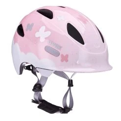 Süßer Helm mit Schmetterling, Rakete und innovativen Details, die für Schutz und Komfort auf dem Kindersitz und dem eigenen (Lauf-)Rad sorgen. Innen schmiegen sich weiche Bärchenpolster an den Kopf.